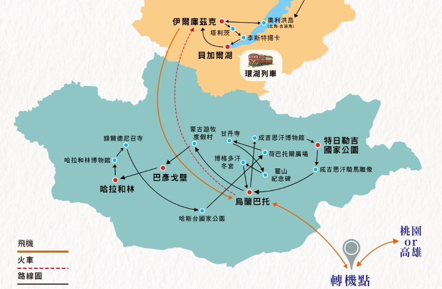 【博格多汗冬宮博物館(入內)】這座宮殿是蒙古末代帝王哲布尊丹巴八世冬天的住所,也是全蒙古第一座2 層樓房,大致上仍保存原來的面貌。宮殿內展示著鑲滿玉片的龍袍、純金金履衣、800 顆珍珠做成的衣袍、80 隻狐狸做成的大衣等珍貴蒐藏。除了這些珍貴的展覽品外,八世豐富的一生傳奇也是導遊口中談論的好題材。火車站,搭乘世上最長的鐵路【西伯利亞大鐵路】世界上最長鐵路,迄今已百餘年歷史著名路線為蒙古縱貫鐵路,橫跨歐亞大陸、歷經六個時區由烏蘭巴托穿越西伯利亞大陸駛向莫斯科沿途經過無數迥異的自然地貌和人文風情藍天、草原、高山、貝加爾湖、蒙古包、農舍…